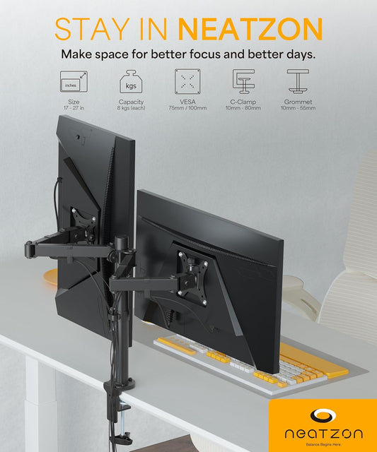 Dual 27" Monitor Arm Desk Mount – VESA Compatible, Up to 8kg per Arm, Cable Management (NZ‑ARM‑01)